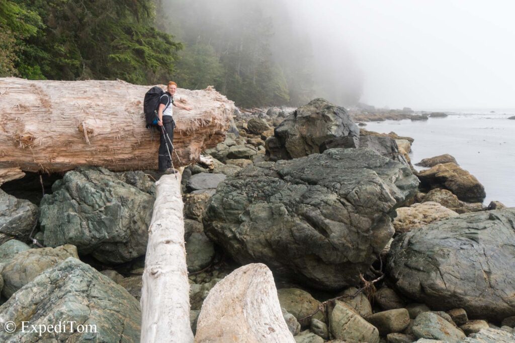 The West Coast Trail was originally built to rescue sailors from frequent shipwrecks about 100 years ago. At first, I wondered why there were so many wrecks along this coast, but eventually found out about the inclement weather, the dense fog and unsure forecasts of this treacherous section of coastline. Today, it is one of the famous trails in Canada to hike over a period of five to seven days. Given our late reservation in June, we were only able to do half the trek starting from Nitinaht.* We chose the more arduous part South of Nitinaht with many ladders.