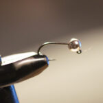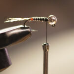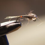 Bring thread to the front and create ribbing by silver wire and tie it down. Add black (dark) dubbing to create thorax and whip finish.