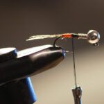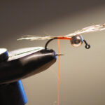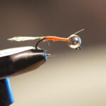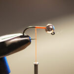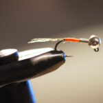 Form base layer with orange thread and bring it to the hook shank. Tie in tail fibres (pheasant tail or Coq de Leon) before whip finish. Cut excess of tail fibres.