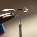 - Tie in tail fibres (pheasant tail or Coq de Leon) before whip finish.
