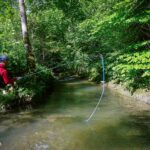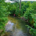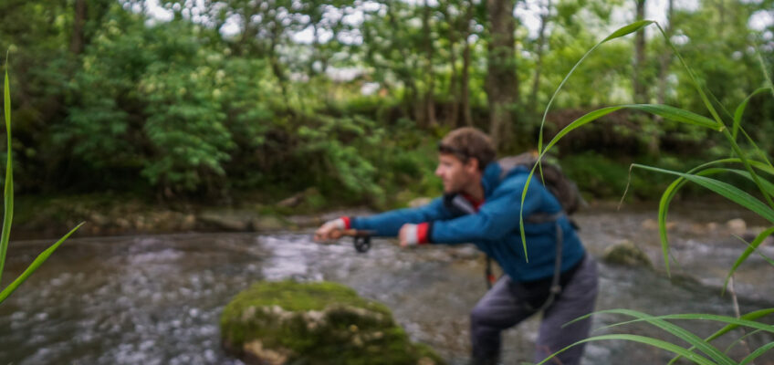 The creek we visited in the Jura mountains is rather small and at various places overgrown. Yet, it is at these places that the water holds its secrets. I tied on a #14 Royal Wulf in tandem with a small gold bead nymph. Advising him how to approach the first cascade, I showed Attie how I read the water and where I expect fish to hide. Given the tightness of the casting space, I taught Attie the roll cast, the bow and arrow as well as another “cast” to put the fly where it needed to be. The latter being not really a cast but rather a move while holding the fly in your hand. Even tough Attie’s casts were accurate enough, there was no bite.
