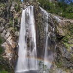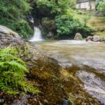 A mere 200 vertical meters below the road, the clear water with a greenish hue gushed out of the canyon. The water emptied into one of the most beautiful pools I have ever seen. The tiny path downwards was officially closed, and a sign stated that you proceed at your own risk. This beauty of a pool was a risk worth taking and I swiftly climbed over the barrier boards blocking the way. The path descended quickly to a stone bridge. Crossing the arc of the old footbridge, I looked down into the roaring chute the river has cut into the granite over millennials. Leaving the stone arc behind, I followed the trail, which gradually got steeper. Entire uprooted trees blocked the way. The path dropped dangerously steep towards the chute that is an additional 20 meters fall. A wrong step was certain death.