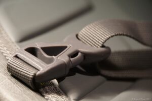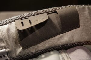The sling pack has attachment points at the sling as well as on the back of the bag. At the sling, there is an insertion point for scissors or clamps. Moreover, there are several small holes to attach a retractor, which, for instance, holds an Amadou or a bottle of grease.