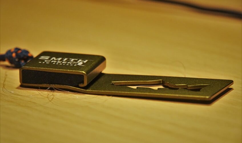 The Smith Creek Trash Fish is a tiny gadget, which holds your spent line. The weight is only 10 grams and therefore is extremely lightweight. It consists of an anodized aluminium plate, which is at one side doubled and has foam in between. This foam enables the Smith Creek to attach waste line by wrangling around the plate and pulling it into the foam.