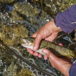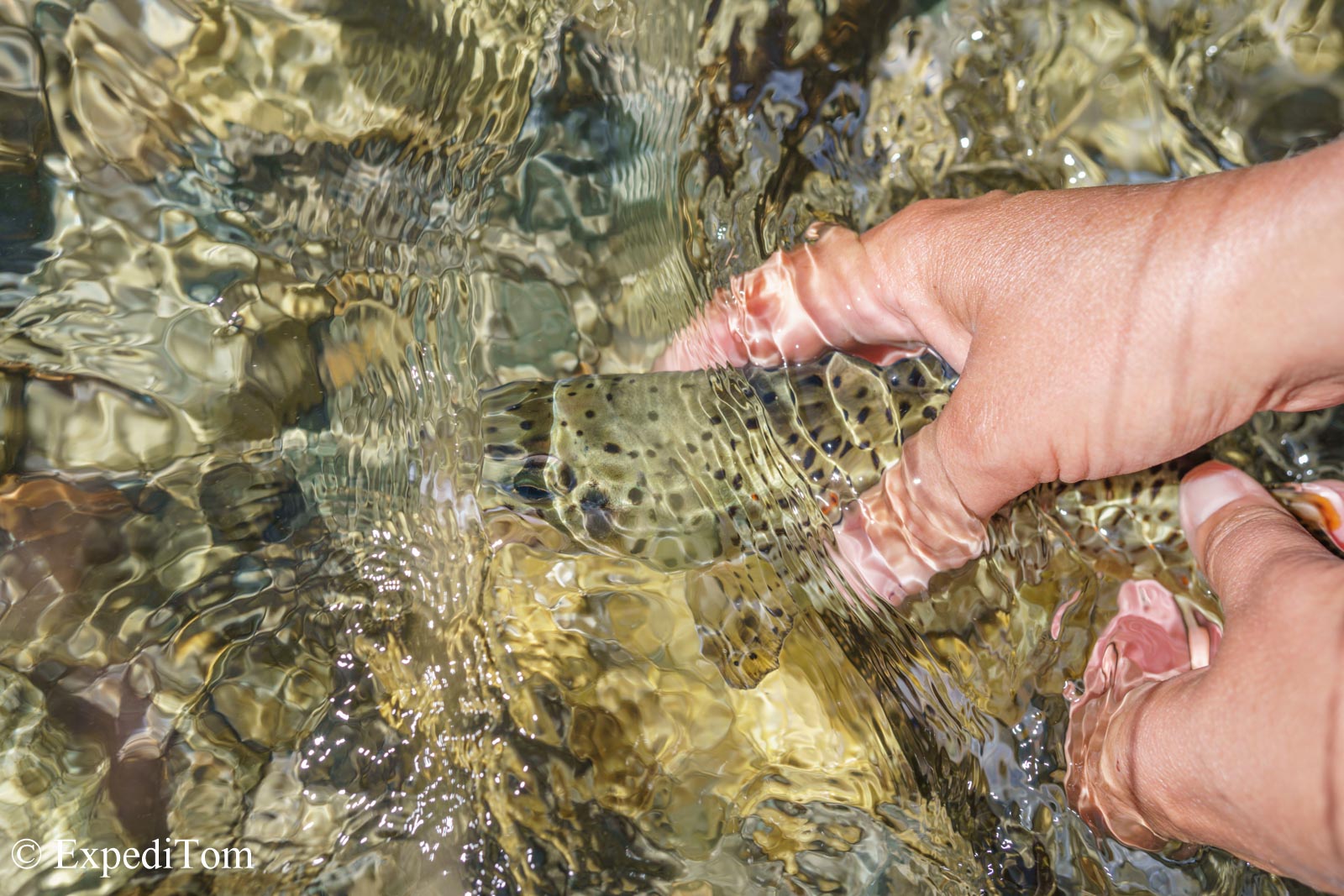 It was clear to me that we needed to down-size. Hence, I changed the leader to a 6x and tied on a #20 ant pattern. Heidi made another cast and unfortunately hooked the vegetation. Retying the rig again, we tried again. This time, the fly nicely drifted towards the fish and he sulked it down in slow motion. Immediately, I sprang up from my knees and jumped into the creek – without waders – and the rest is history.