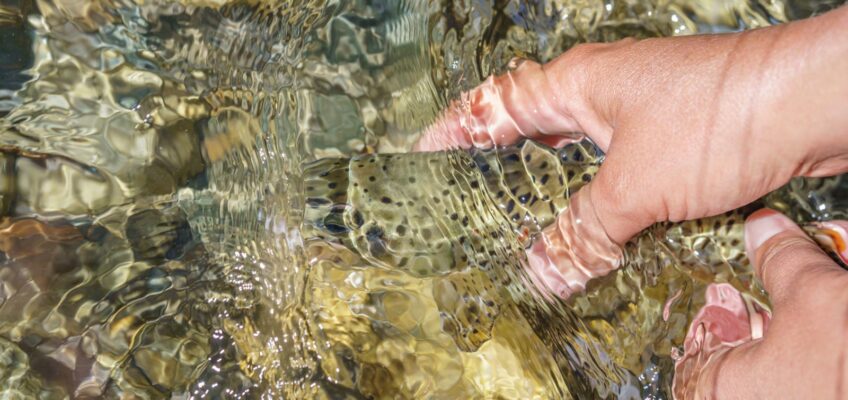 On the second day, our group visited a crystal clear mountain creek. Whereas the more experienced anglers hiked to the headwaters, the beginners stayed with me. On the way along the stream, I taught some basic skills of reading the water. Small streams are challenging in regards to casting. Therefore, I showed them a few tricks in tight spots. Continuing upstream, my goal was that every beginner hooks a fish.